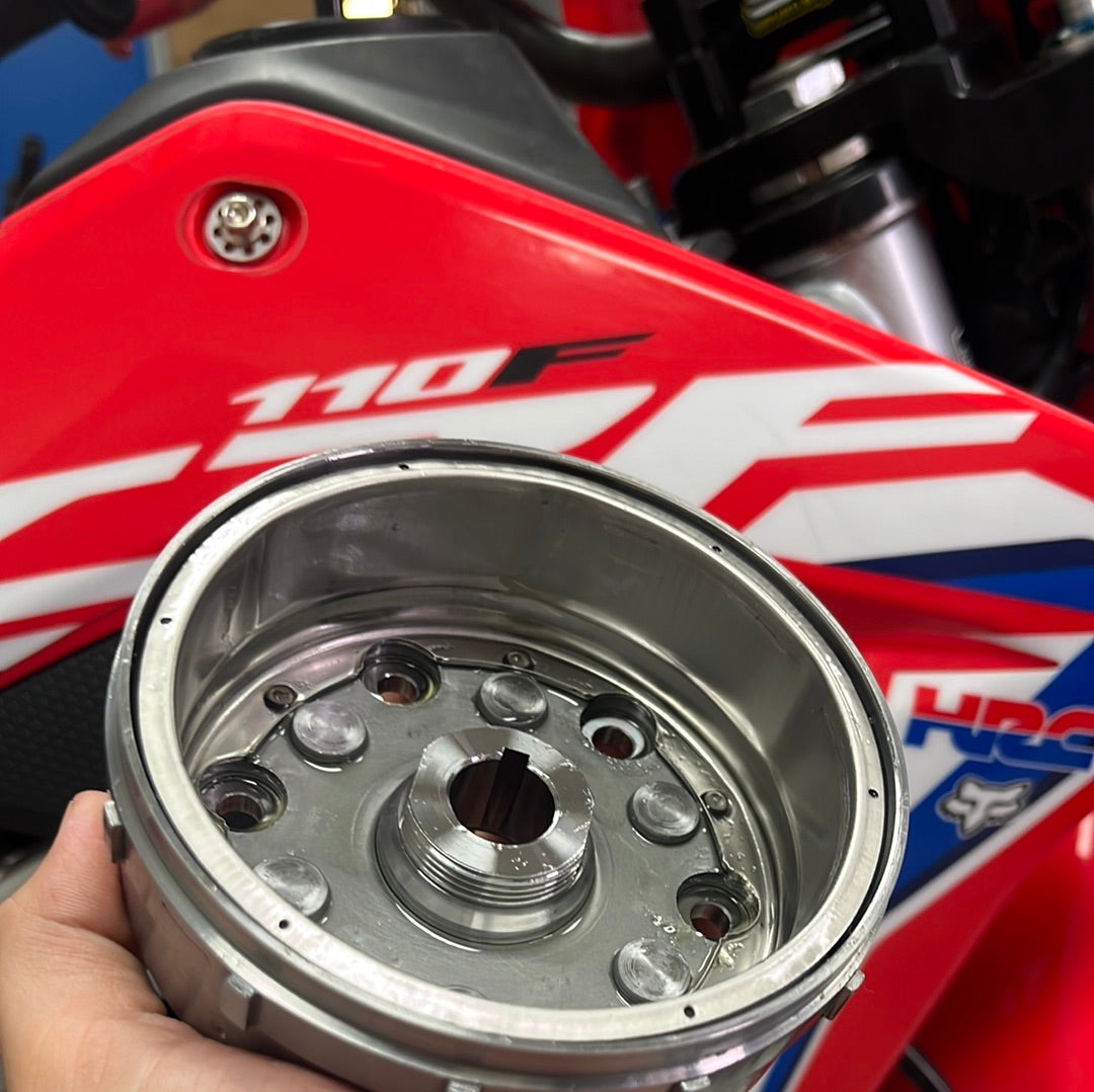 Honda CRF110F lightweight flywheel eliminates rotating mass from the crankshaft allowing the bike to rev up much quicker.